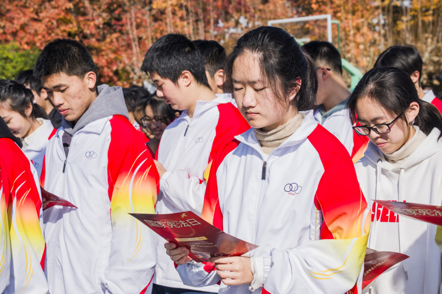 12月4日上午,全校师生员工齐聚学校篮球场,在庄严的国旗下,举行宪法晨读活动。