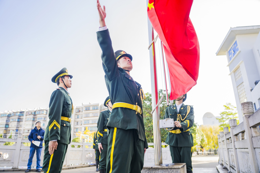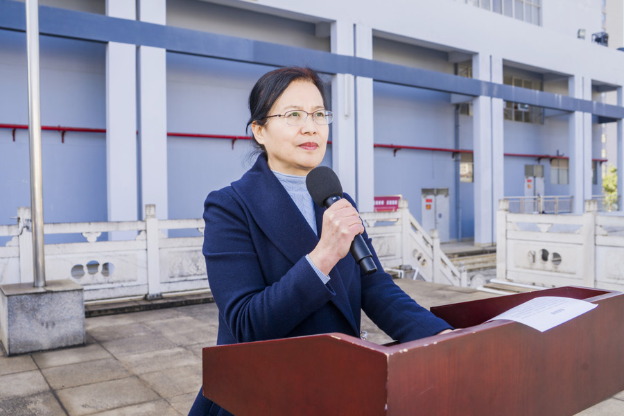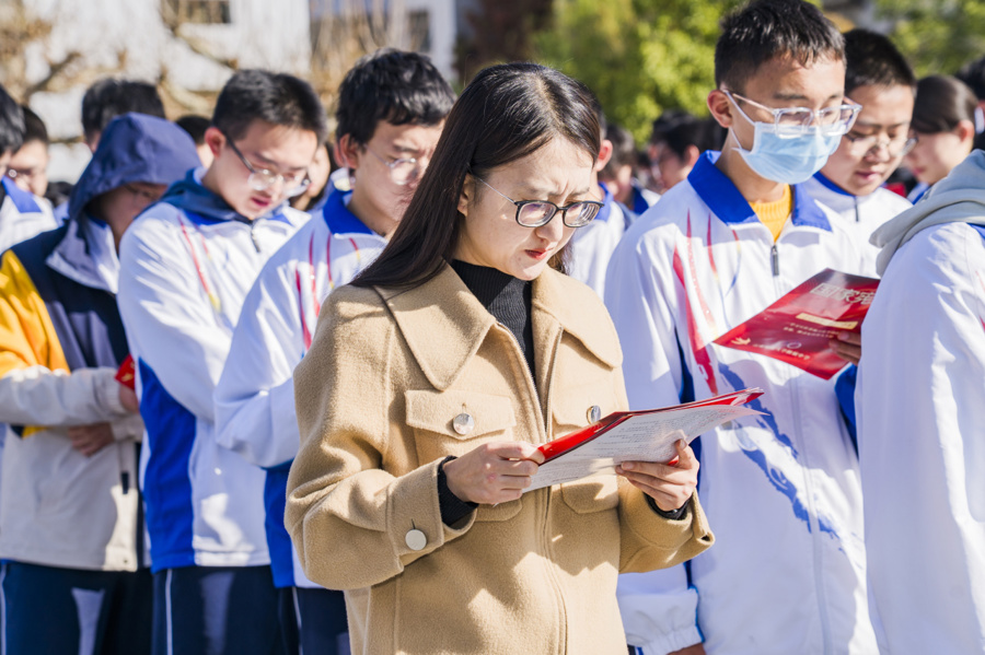 党委书记王英领诵,全体师生齐声诵读宪法部分条款。