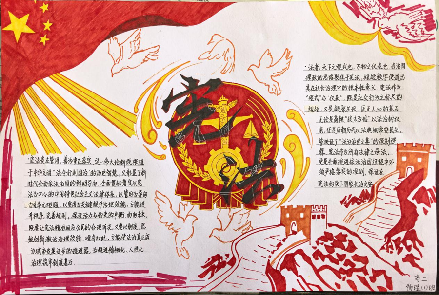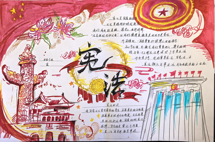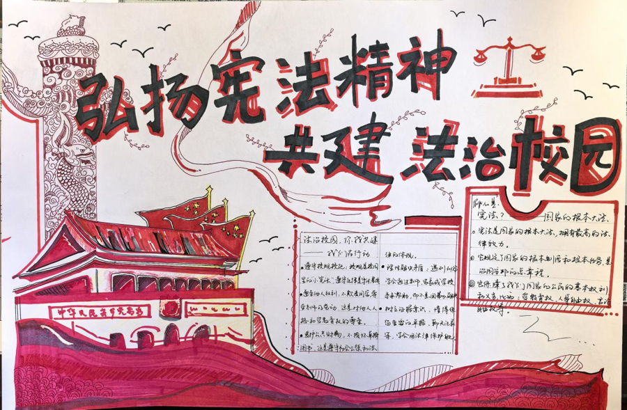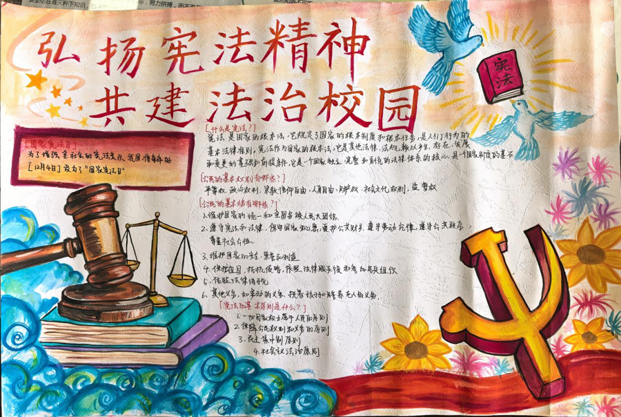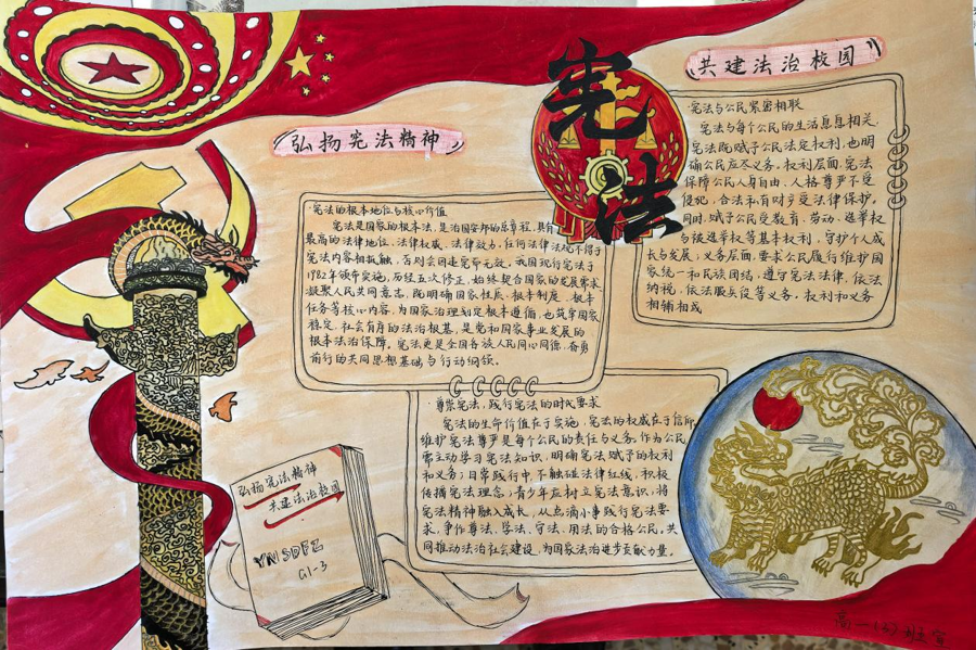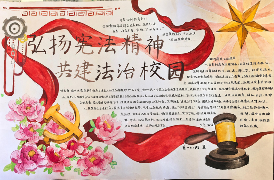 近日,校团委组织高一、高二年级开展了“弘扬宪法精神,共建法治校园”手抄报评比活动。同学们围绕宪法精神、公民权责等主题,精心设计创作,以图文形式表达对宪法的理解,营造了校园学法守法的良好氛围。