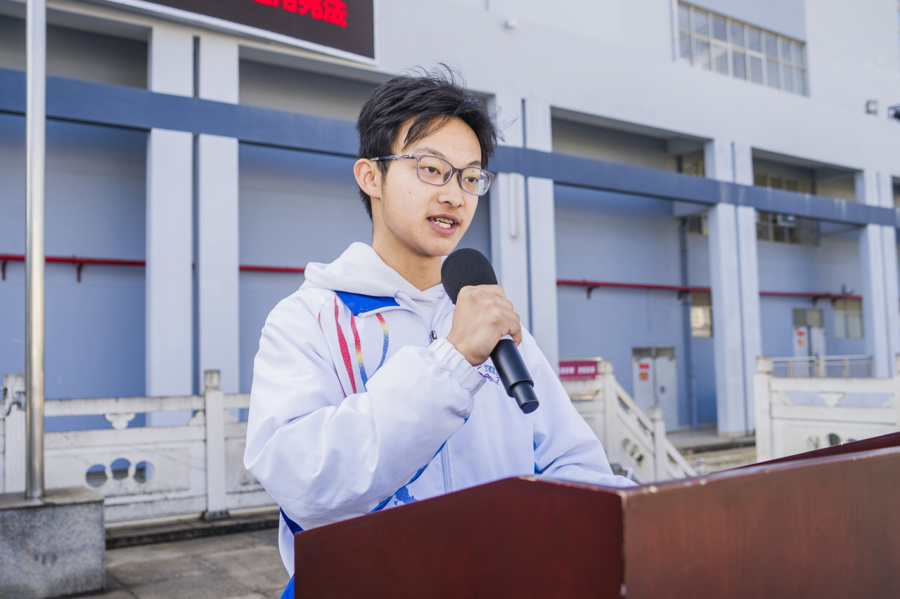 高二理五班董洪铭同学发表了题为“宪法护航,青春有章”的国旗下演讲。他从高中生的视角出发,将宏大的宪法叙事与鲜活的校园生活紧密相连。他呼吁同学们认识到,宪法并非遥不可及,而是成长路上最坚实的后盾,青春的精彩篇章需要在法治的轨道上从容书写。